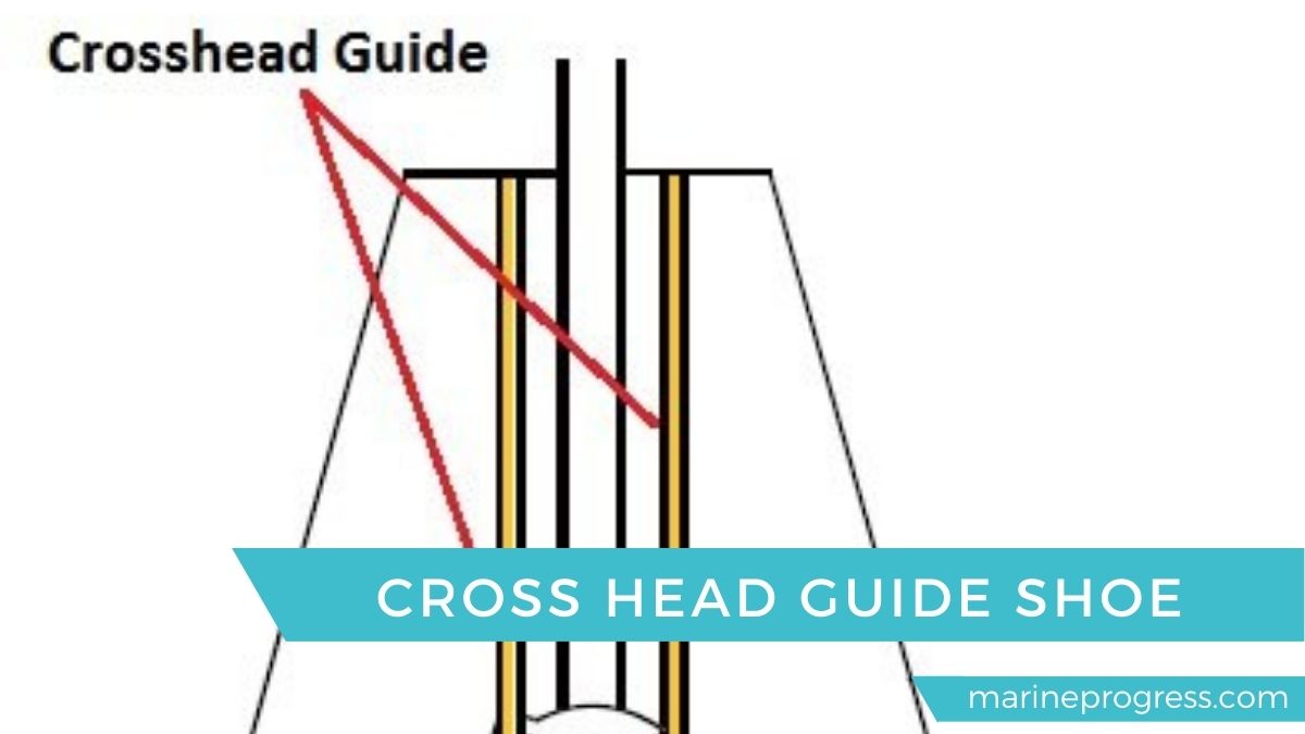 The rotation limits by stop screws or similar. This float ensures that an oil wedge can form between the shoe and guide bar when turning ahead and astern. Fore and aft alignment of the crosshead adjusts by the shims located between the inner edges of the crosshead guide shoes and their respective guide strips. The guide strips the project from the shoes and contacts the sides of the tile guide bas.